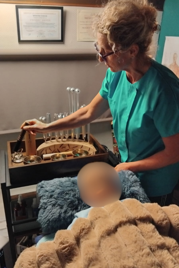 - Le soin se déploie en une alternance harmonieuse : d’abord des sons doux et des instruments, puis un massage délicat du visage, du cuir chevelu, des trapèzes et de la nuque, avant de revenir aux instruments.